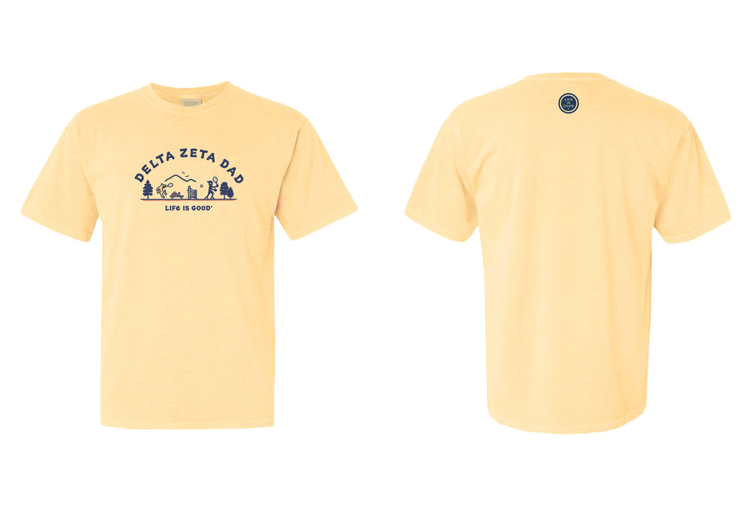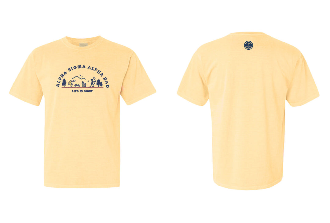 - Featuring a yellow t-shirt with the sorority name, life is good, and a tennis design for your dad. The design is displayed on both the front and back, perfect for representing your dad to represent your sorority.
